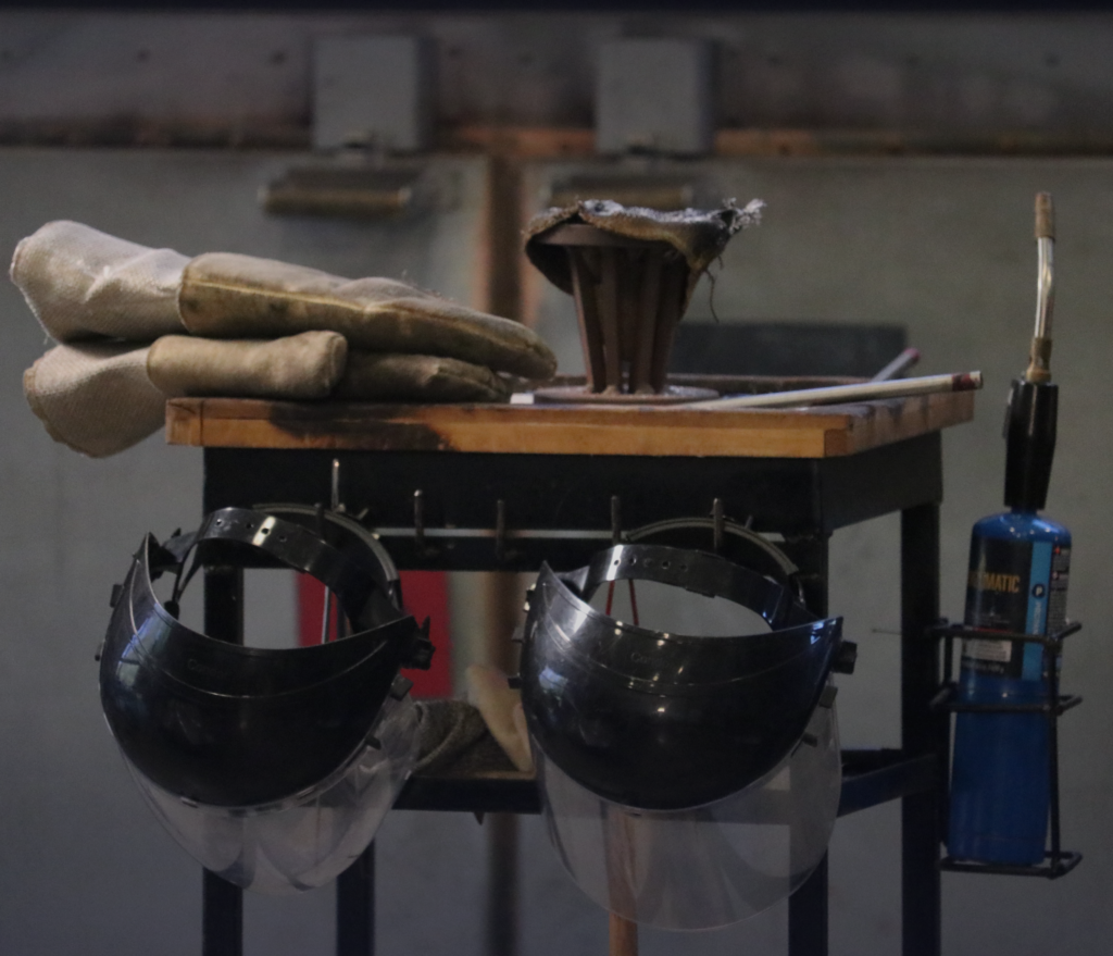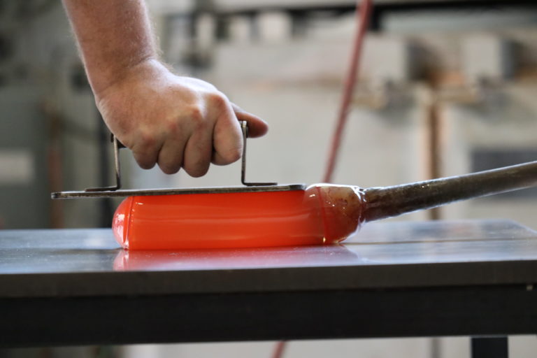 Molten glass is pressed into shape in the Glick Center.