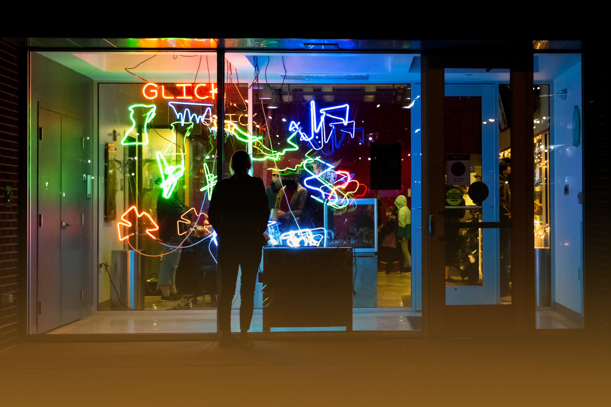 Student standing with his back facing the camera, looking through the window into the Glick Center at neon signs.